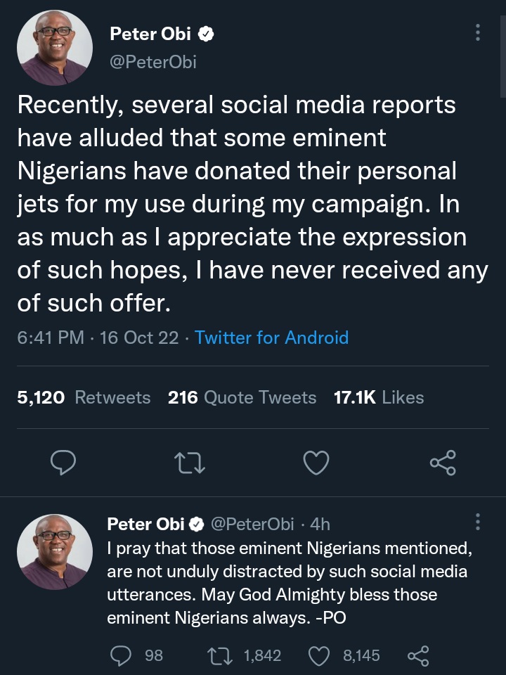 Labour Party presidential candidate, Peter Obi has reacted to reports that he received private jet donations for his campaign.