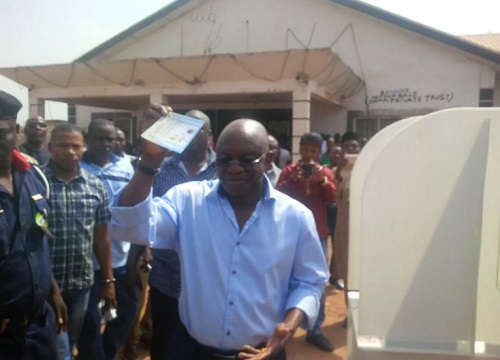 The embattled senator voted at Otukpo Club polling unit in Otukpo Township Ward 1 at about 10.58am this morning. He was spotted in company of his wife few distance from his house to his polling unit and was cheered by crowd of voters.