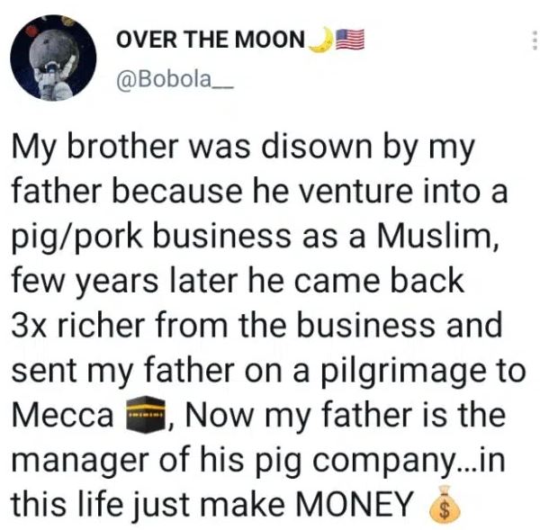 “My brother was disown by my father because he venture into a pig/pork business as a Muslim, few years later he came back 3x richer from the business and sent my father on a pilgrimage to Mecca 🕋, Now my father is the manager of his pig company…in this life just make MONEY 💰.”