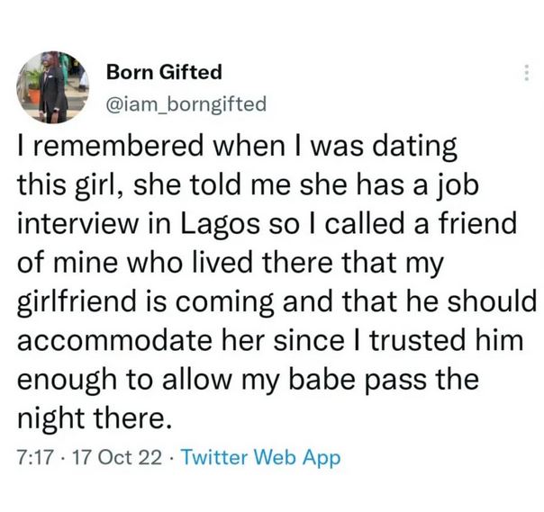 A Nigerian man has taken to Twitter to narrate how he lost his babe to his best friend after he asked him to help accommodate her.