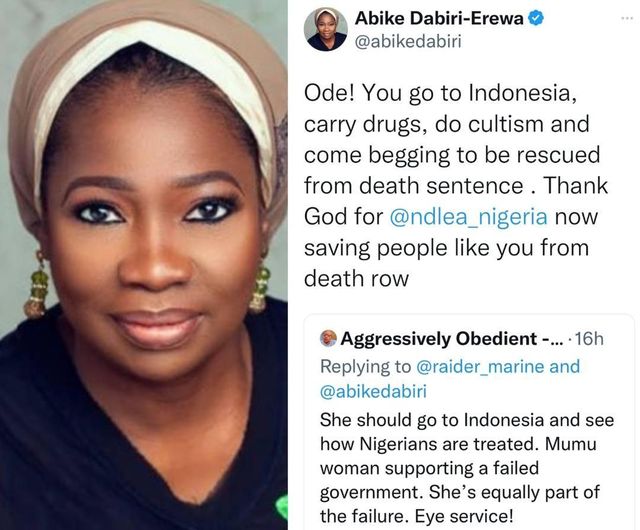 Responding to the tweet, Dabiri-Erewa said, “Ode! You go to Indonesia, carry drugs, do cultism, and come begging to be rescued from death sentence. Thank God for NDLEA (National Drug Law Enforcement Agency) now saving people like you from death row.”