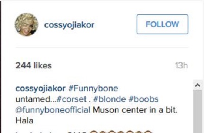 Cossy Ojiakor took to her Instagram page to showcase her hot outfit to FunnyBone's Untamed comedy show yesterday night.