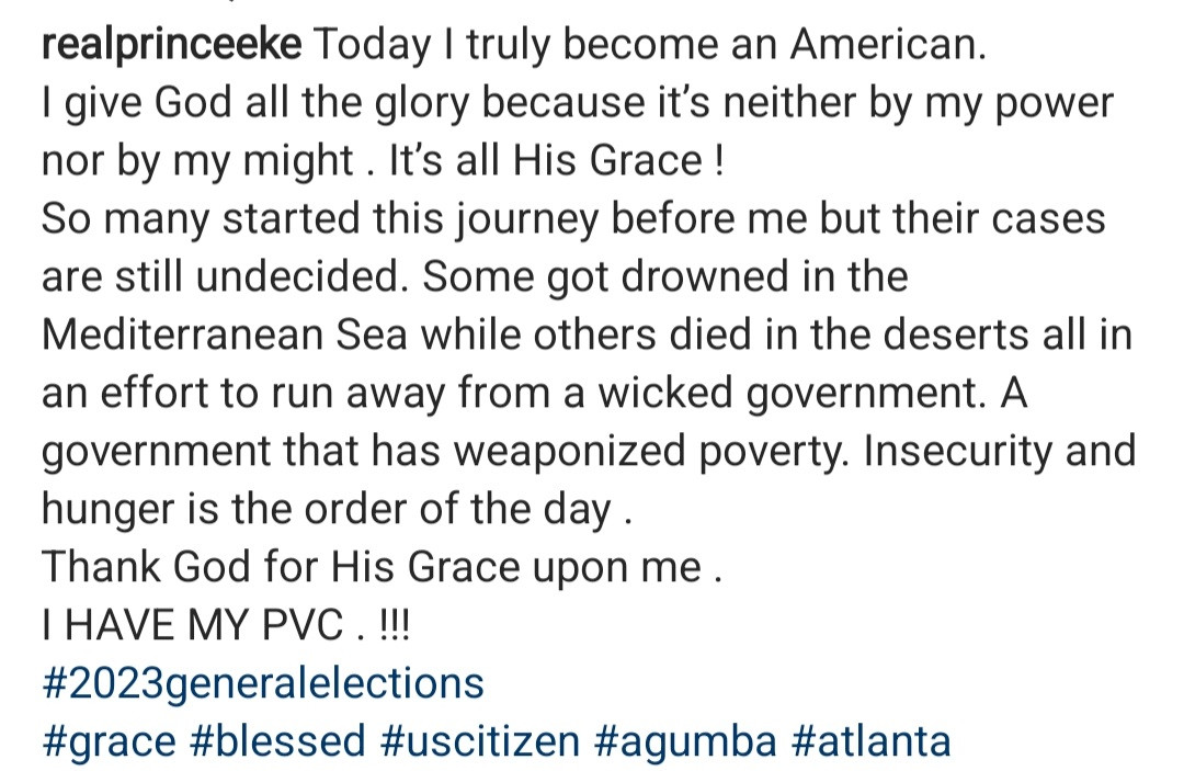 Nigerian actor, Prince Eke is now a citizen of the United States of America.