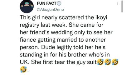A Twitter user has taken to the microblogging platform to narrate how a lady nearly scattered Ikoyi registry after she caught her fiance marrying another woman.