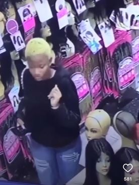 A young lady has been caught on CCTV stealing a wig from a store while hiding the mannequin it was displayed on.