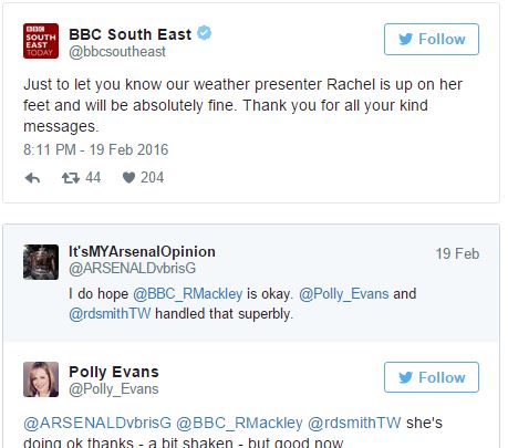 The BBC South East news team later tweeted out that Rachel was ‘up on her feet and will be absolutely fine’, while both Polly and Rob confirmed the news.