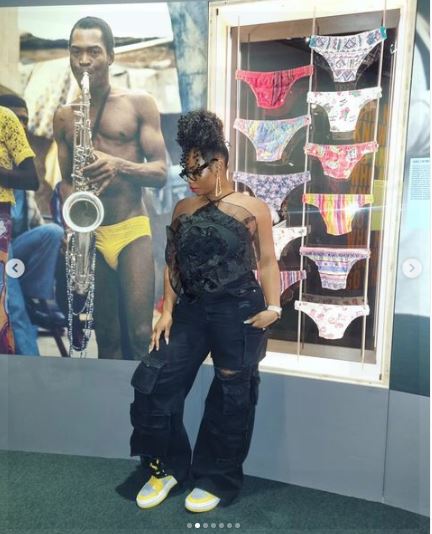The award-winning songstress posted photos of herself with Fela’s portrait on colorful pants.