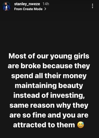 In his words: “Most of our young girls are broke because they spend all their money maintaining beauty instead of investing, same reason why they are so fine and you are attracted to them”