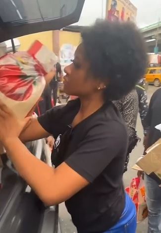 She shared some food items to the less privileged residents of Lagos state.