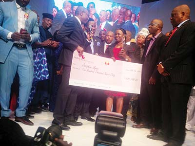 Mrs. Josephine Agwu presented with a cheque at the Sun Newspaper Awards in Lagos