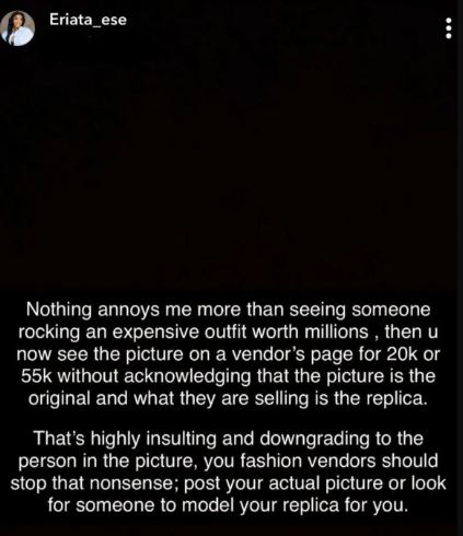 In a post shared on Instastories, Ese stated that nothing annoys her more than fashion vendors using the photo of a person wearing an expensive outfit and then selling the expensive outfit far less and not indicating that what they are selling are replicas.