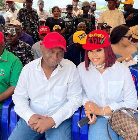 The mother of two who has been supporting her husband’s senatorial campaign in Delta State was spotted comforting her man with an endless display of affection.