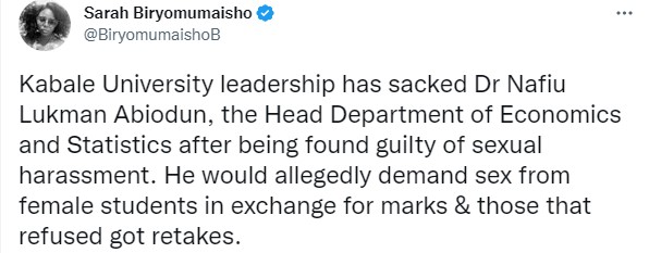 "Kabale University leadership has sacked Dr Nafiu Lukman Abiodun, the Head Department of Economics and Statistics after being found guilty of s3xual harassment. He would allegedly demand s3x from female students in exchange for marks & those that refused got retakes."