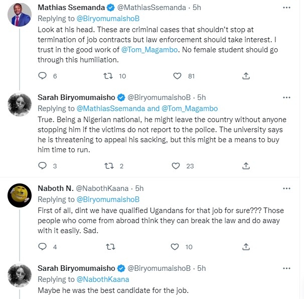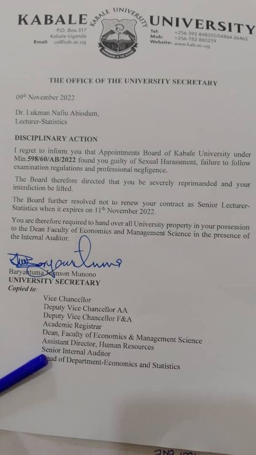 A Ugandan University, Kabale University has fired a Nigerian lecturer, Dr Nafiu Lukman Abiodun accused of s3xual harassment.