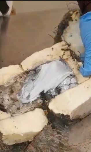 The spokesperson of the agency, Femi Babafemi, shared a video showing the operatives opening the concealed hard drugs in the tuber of yam.