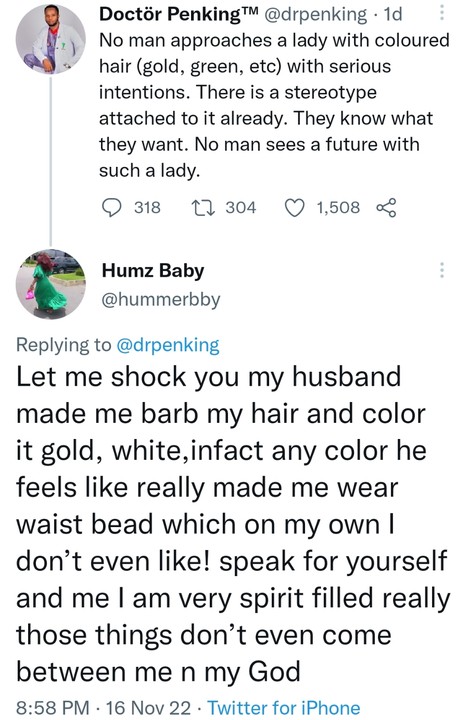Sharing his opinion on Twitter, @drpenking said no man will approach a woman with dyed hair with serious intentions because there’s a stereotype attached to coloured hair.