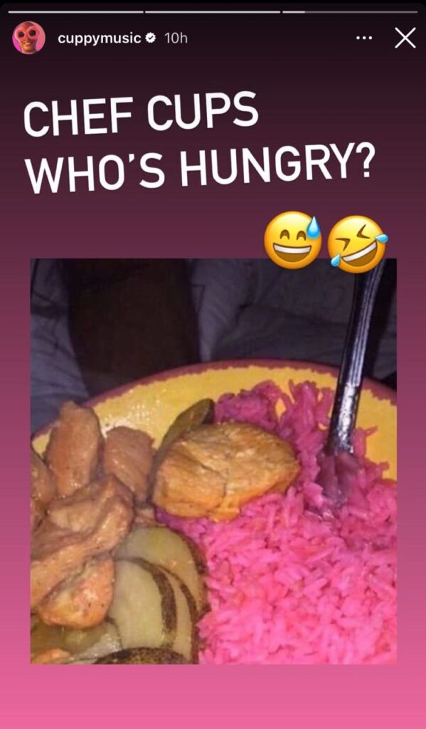 The 30-year-old entertainer who has a strong obsession with pink, captioned the photo, “Chef Cups, Who’s hungry.”