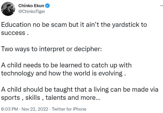 He tweeted; "Education no be scam but it ain’t the yardstick to success . Two ways to interpret or decipher: A child needs to be learned to catch up with technology and how the world is evolving .