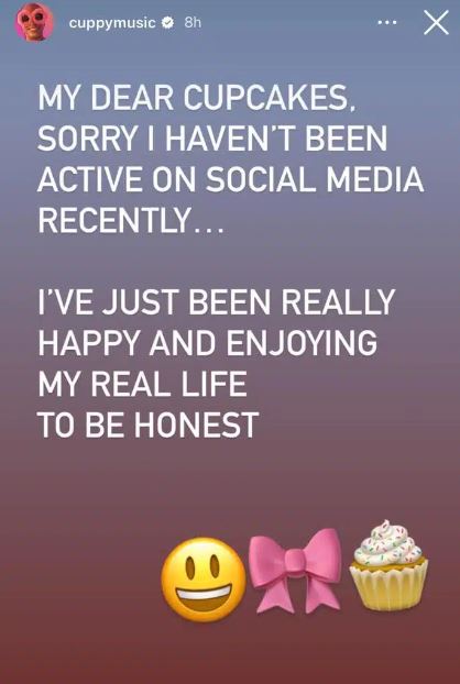 “MY DEAR CUPCAKES, SORRY I HAVEN’T BEEN ACTIVE ON SOCIAL MEDIA RECENTLY… I’VE JUST BEEN REALLY HAPPY AND ENJOYING MY REAL LIFE TO BE HONEST”. She wrote.