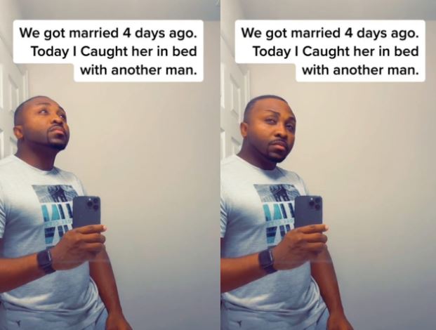 In a video shared on Tiktok, the man who looked quite sad wrote; ''We got married four days ago. Today I caught her in bedwith another man''