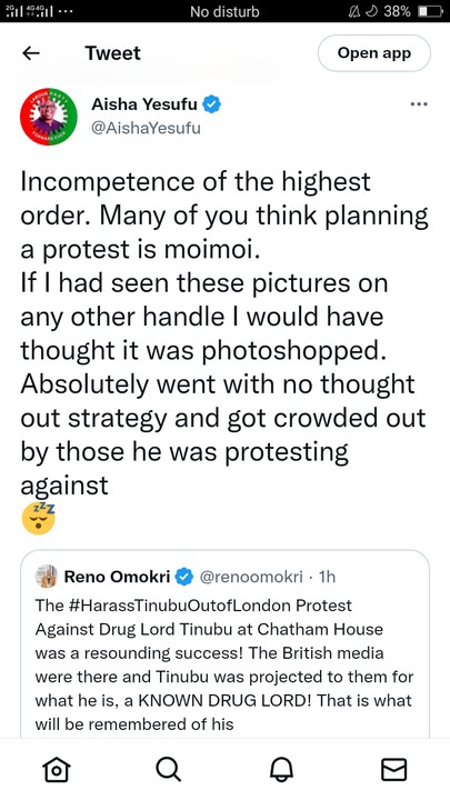 Nigerian activist, Aisha Yesufu has mocked Reno Omokri after he staged a protest against Bola Tinubu, the presidential candidate of the All Progressives Congress in London.