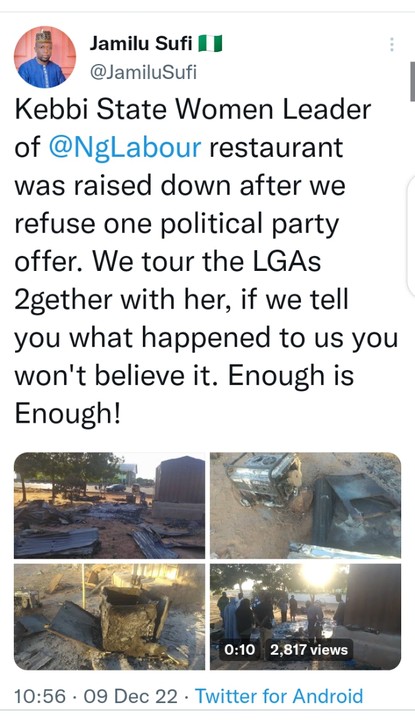 "Kebbi State Women Leader of Labour restaurant was razed down after we refused one political party's offer.