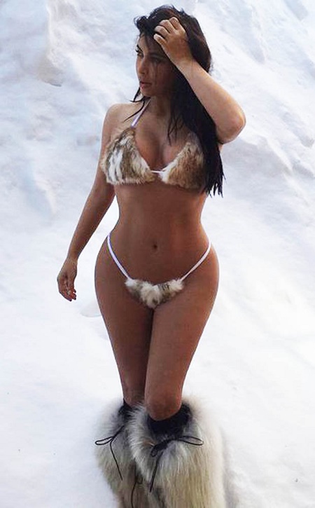Reality TV star, Kim Kardashian has set the hearts of her fans panting after she posted a throw back picture of herself wearing a tiny bikini thong in the snow showing off her booty and killer curves.