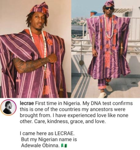 Taking to his Instagram page on Friday December 16, the 'Jireh' hit maker said that his Nigerian name is 'Adewale Obinna,' after visiting Nigeria for a concert.