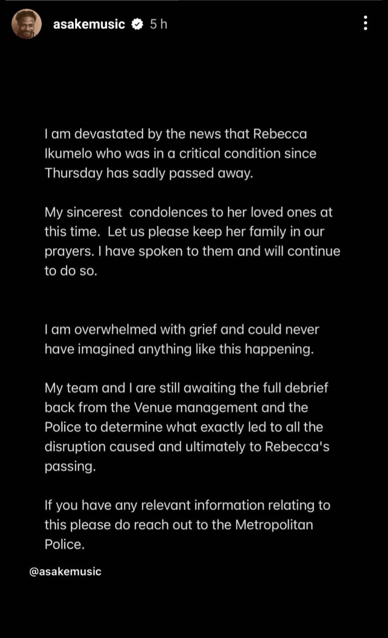 World-famous Nigerian singer, Asake has reacted to the passing of a 33-year-old Nigerian lady, Rebecca Ikumelo, who got injured at his London concert.