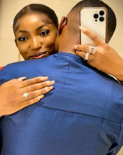 Posting a photo flaunting her ring while embracing her man and wrote;