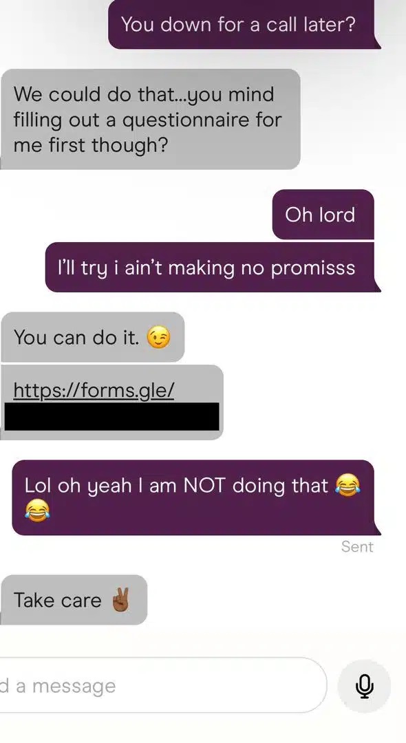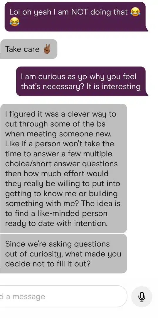 “I figured it was a clever way to cut through some of the bs when meeting someone new. Like if a person won’t take the time to answer a few multiple choice/short answer questions then how much effort would they really be willing to put into getting to know me or building something with me? The idea is to find a like-minded person ready to date with intention.