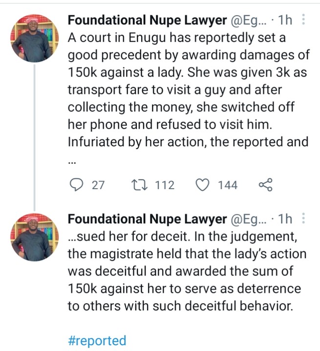 "A court in Enugu has reportedly set a good precedent by awarding damages of 150k against a lady. She was given 3k as transport fare to visit a guy and after collecting the money, she switched off her phone and refused to visit him. Infuriated by her action, the reported and …sued her for deceit. In the judgement, the magistrate held that the lady’s action was deceitful and awarded the sum of 150k against her to serve as deterrence to others with such deceitful behavior.