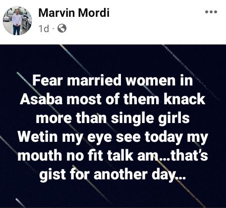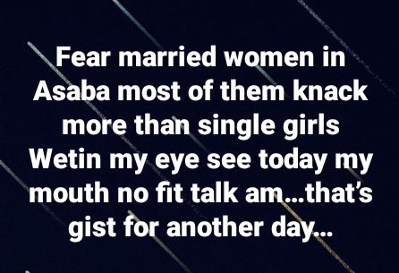 "Fear married women in Asaba most of them knack more than single girls Wetin my eye see today my mouth no fit talk am…that’s gist for another day," he wrote.