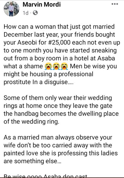"How can a woman that just got married in December last year, your friends bought your Aso ebi for #25,000 each not even up to one month you have started sneaking out from a boy room in a hotel at Asaba what a shame. Men be wise you might be housing a professional pr*stitute In a disguise,"