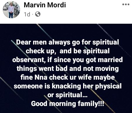 "Dear men always go for spiritual check up, and be spiritual observant, if since you got married things went bad and not moving fine Nna check ur wife maybe someone is knacking her physical or spiritual…Good morning family!!!" he added.