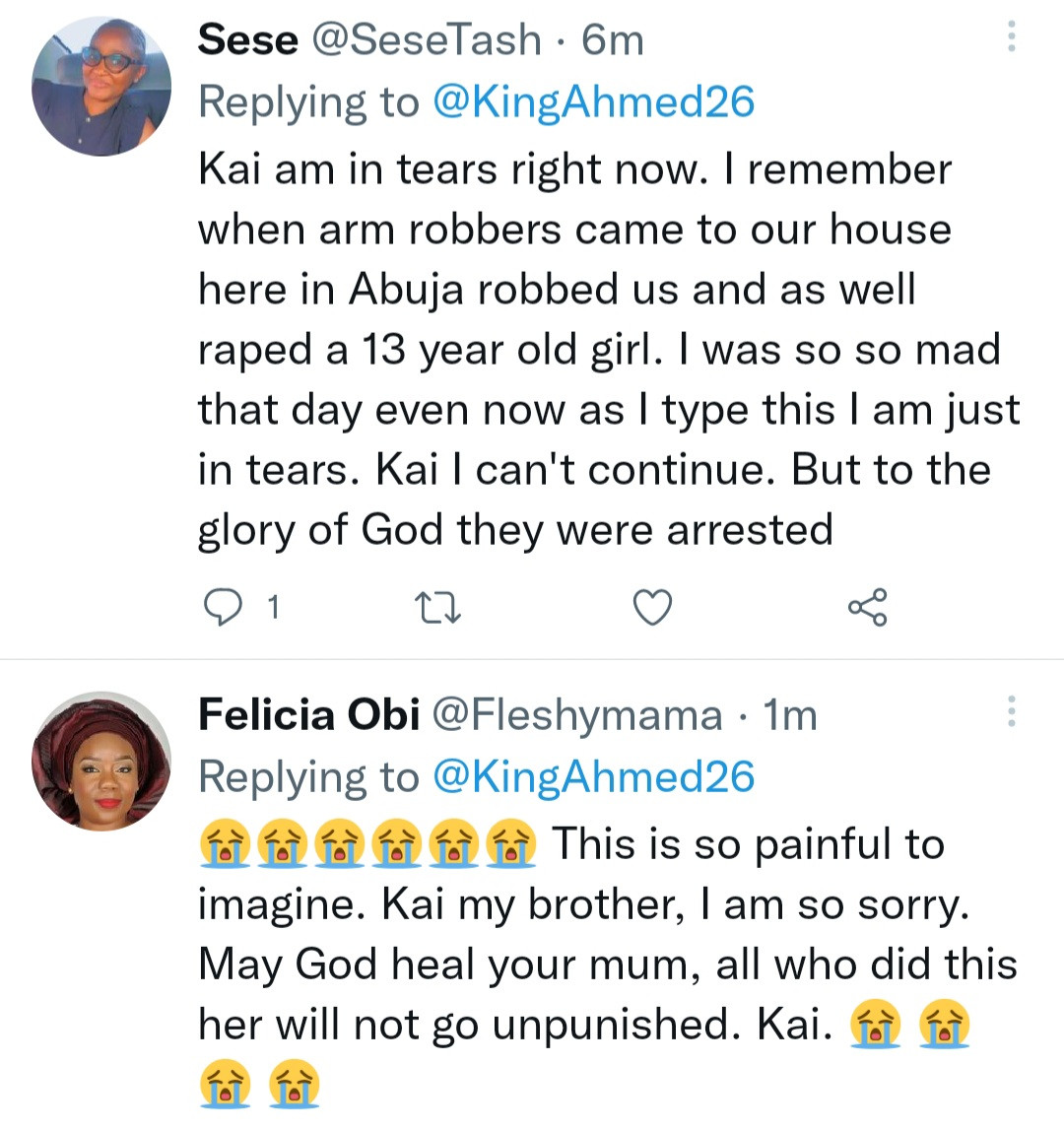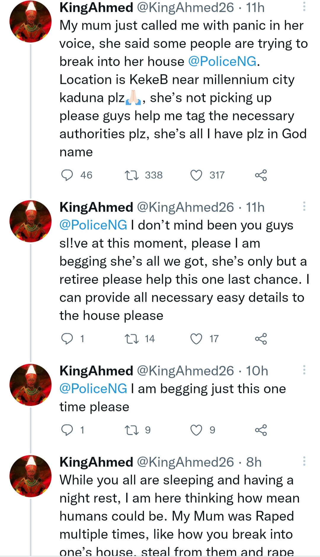 The young man had sent out an SOS on Twitter last night. He explained that his mum called him in panic that people were trying to break into her home in Kaduna.