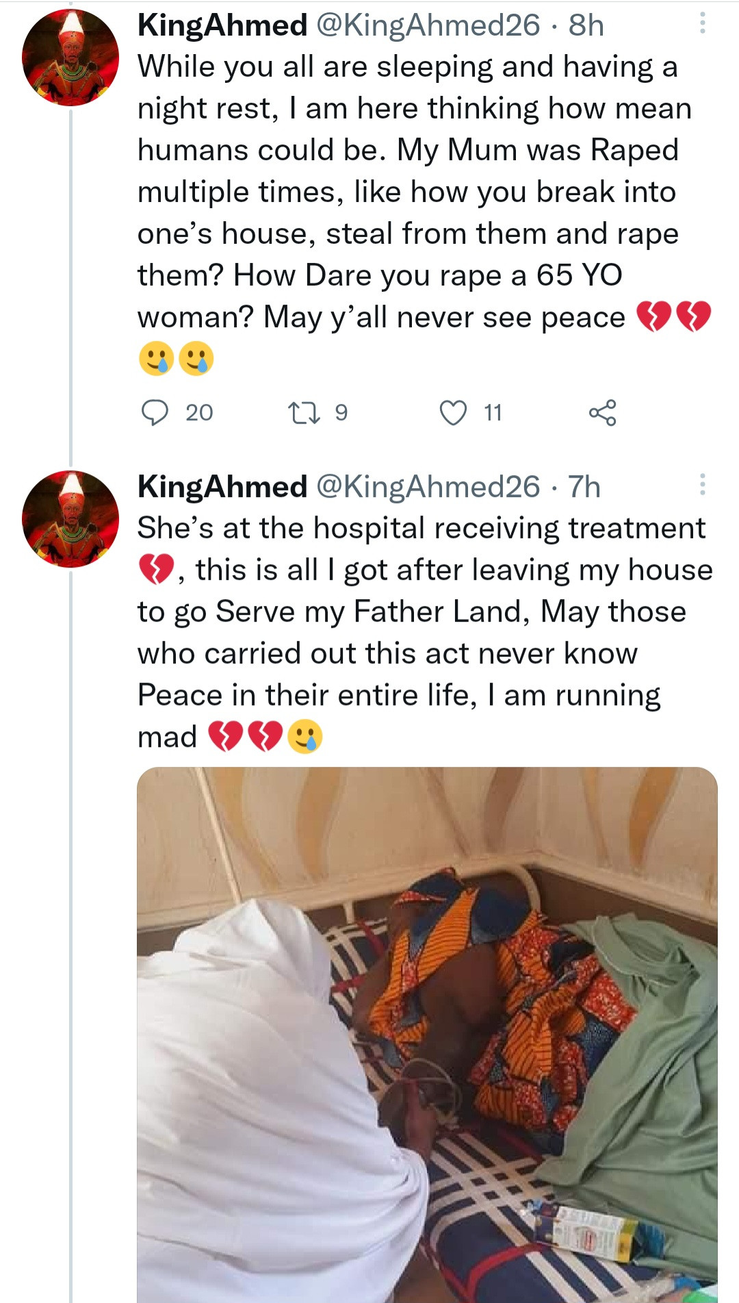 He disclosed on Twitter that his 65-year-old mother was r*ped multiple times by robbers who broke into her home last night, Jan. 29.