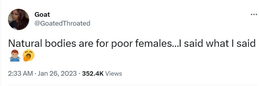 A Twitter user has taken to the microblogging platform to give her opinion on women that go under the knife to enhance their bodies.