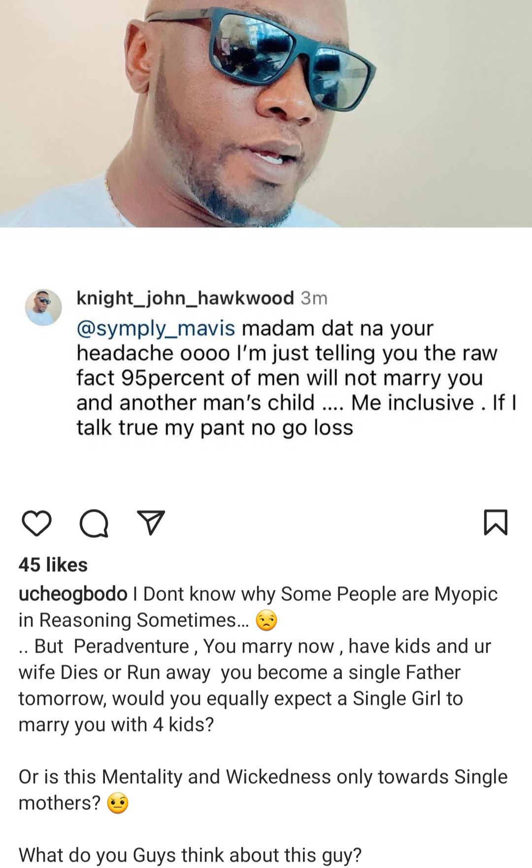 She slammed the male Instagram user who said 95% of men will not marry single mothers.