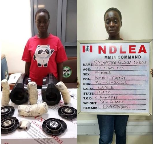The NDLEA operatives stationed at the NAHCO export shed of the Murtala Mohammed International Airport on January 30, arrested a pregnant woman, Mrs. Sylvester Gloria Onome, after 800grams of skunk were discovered concealed in two small radio sets she was sending to Dubai, United Arab Emirate.