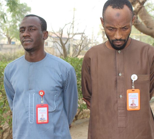 "The team immediately proceeded to the scene and arrested the two suspects while trying to escape, one Mujahid Kabir, 'm', 30 Years old, of Ahmadu Bello Way and Abba Imam, 'm', 30 years old, of Zoo Road Kano. On spot search, the suspects were found in possession of Vision FM Personnel Identity Cards.
