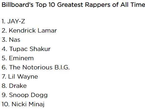 While the list includes female MCs like Lil Kim (No. 31), Lauryn Hill (No. 30), and Missy Elliott (No. 19), Nicki Minaj is the only woman in the top 10.