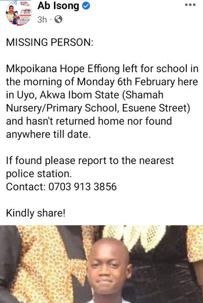 ''Mkpoikana Hope Effiong left for school in the morning of Monday 6th February here in Uyo, Akwa Ibom State (Shamah Nursery/Primary School, Esuene Street) and hasn't returned home nor found anywhere till date. If found please report to the nearest police station. Contact: 0703 913 3856.'' he wrote.
