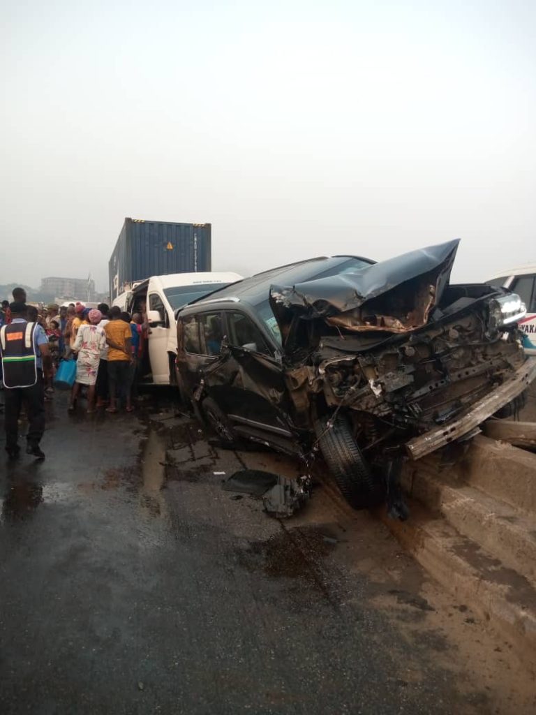 The road crash, it was learnt, involved seven vehicles: a Toyota Sienna (RSH492XE), a Toyota Camry (MUS479HE); a Toyota Hiace bus (FGG685XY); a Lexus SUV (FST907HK); another Lexus SUV (FST904 HK); a Toyota Land Cruiser with no number and a Mack truck.