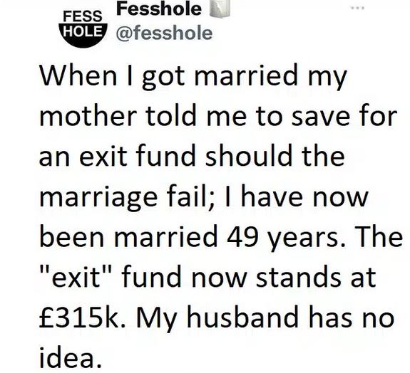 “When I got married my mother told me to save for an exit fund should the marriage fail; I have now been married 49 years. The ‘exit’ fund now stands at 315K. My husband has no idea,” she wrote.
