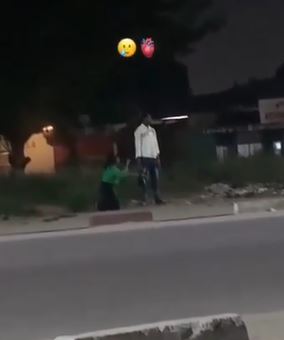 A video has captured the moment a yet-to-be identified lady was spotted kneeling to beg her man by the roadside.