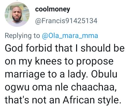 He said this while reacting to photos of a Twitter user, Okey, who proposed to his fiance, Ezinne.