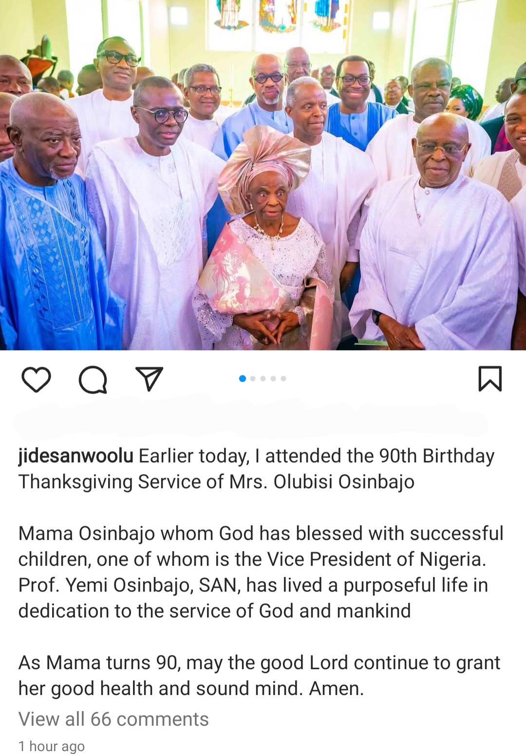 Nigeria's Vice President, Yemi Osinbajo has celebrated his mother's 90th birthday in grand style.