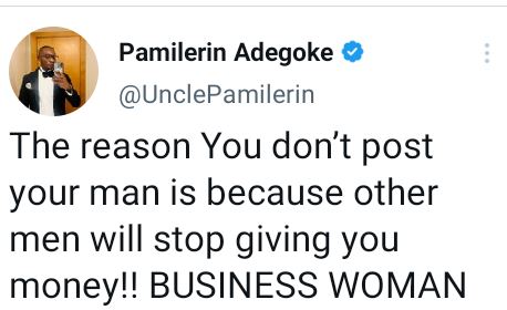 A Nigerian Twitter user, Pamilerin Adegoke has taken to the microblogging platform to reveal why most women don't post their men on social media.