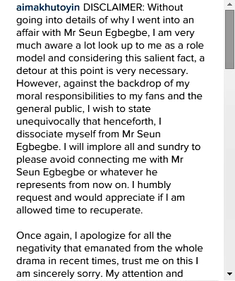 After the entire episode, the actress kept silent and has never said anything about the controversy with her lover until 2 hours ago when she took to her Instagram to apologize to her fans, and offered a disclaimer on her boyfriend, Seun Egbegbe as she disassociated herself from anything that has to do with him.